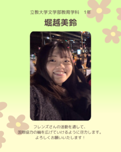 一握りの人しか国際協力に興味を持っていないという現状を少しでも改善し、フレンズさんの活動を通して、国際協力の輪を広げられたら嬉しいです。短い間ですが、どうぞよろしくお願いいたします🌼