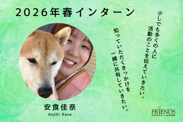 初めまして!これから約2か月間フレンズ・ウィズアウト・ア・ボーダーJAPANさんでインターンをさせていただく、獨協大学の安食佳奈(あんじきかな)です。