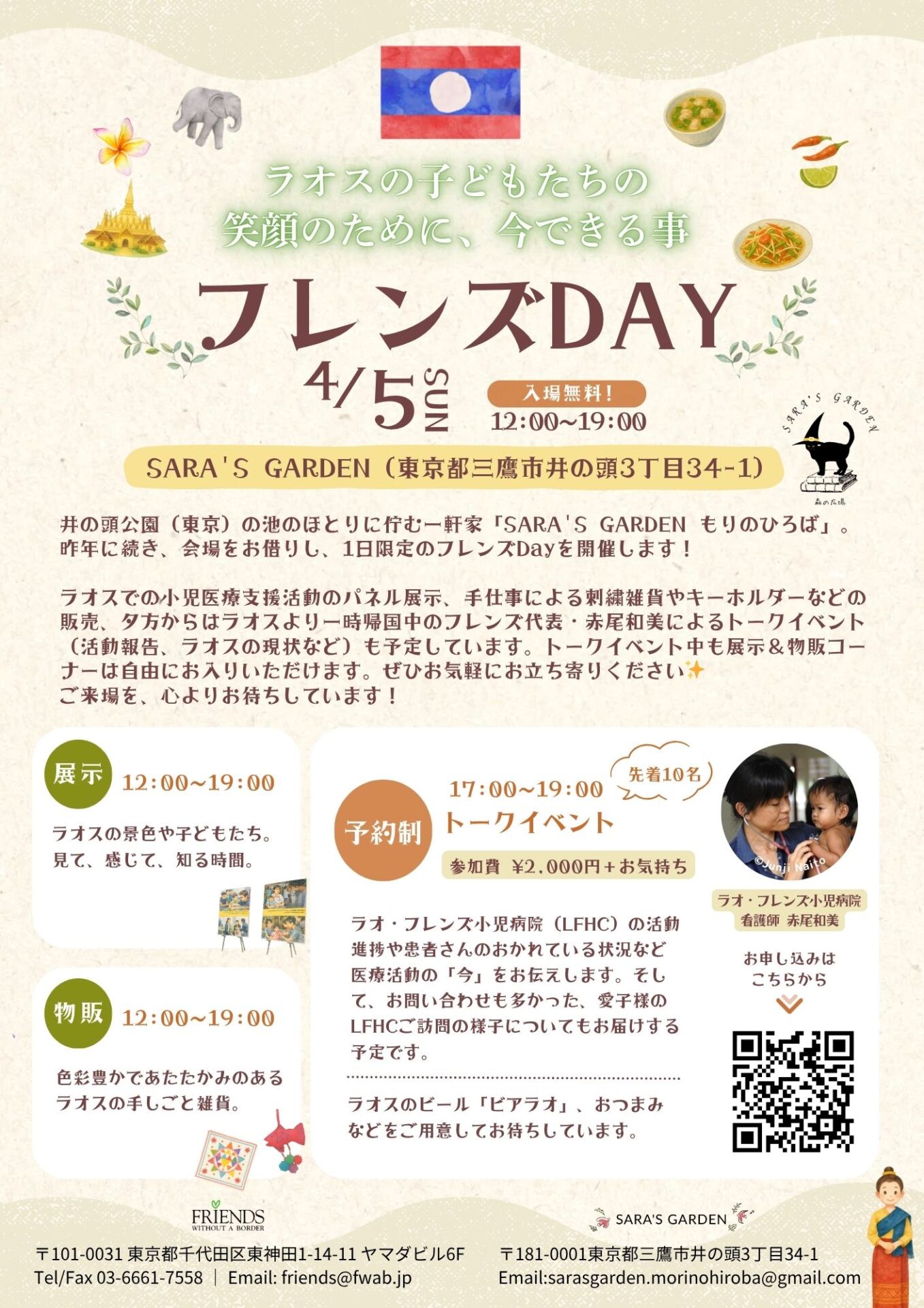ラオスでの小児医療支援活動のパネル展示、手仕事による刺繍雑貨やキーホルダーなどの販売、夕方からはラオスより一時帰国中のフレンズ代表・赤尾和美によるトークイベント(活動報告、ラオスの現状など)も予定しています。トークイベント中も物販コーナーは自由にお入りいただけます。ぜひお気軽にお立ち寄りください✨