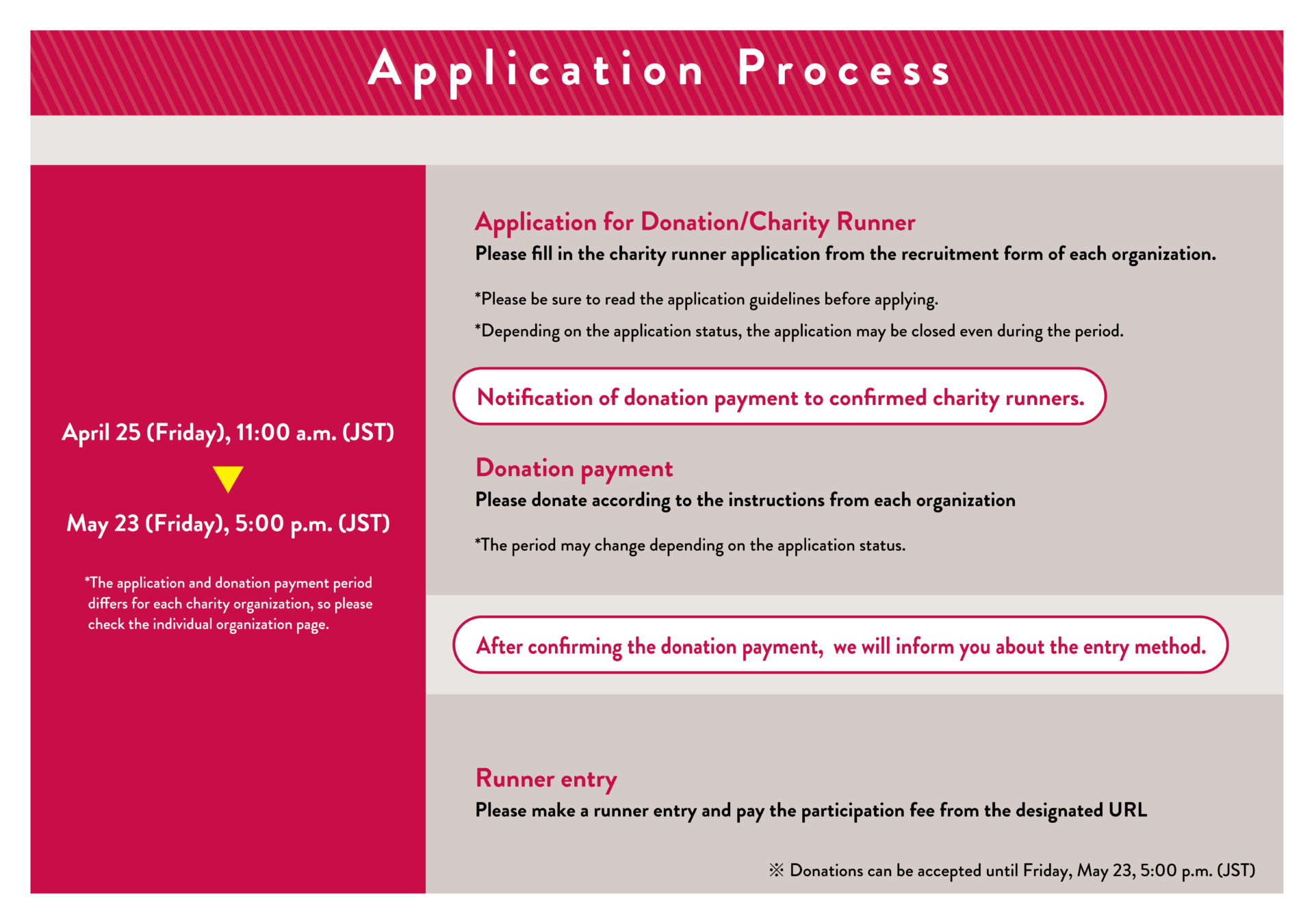 You can support this initiative by making donations. Those who donate more than the amount specified by the charity organization and wish to run as a Charity Runner, may be selected as a Charity Runner and asked to promote the charity activities while participating in the event.