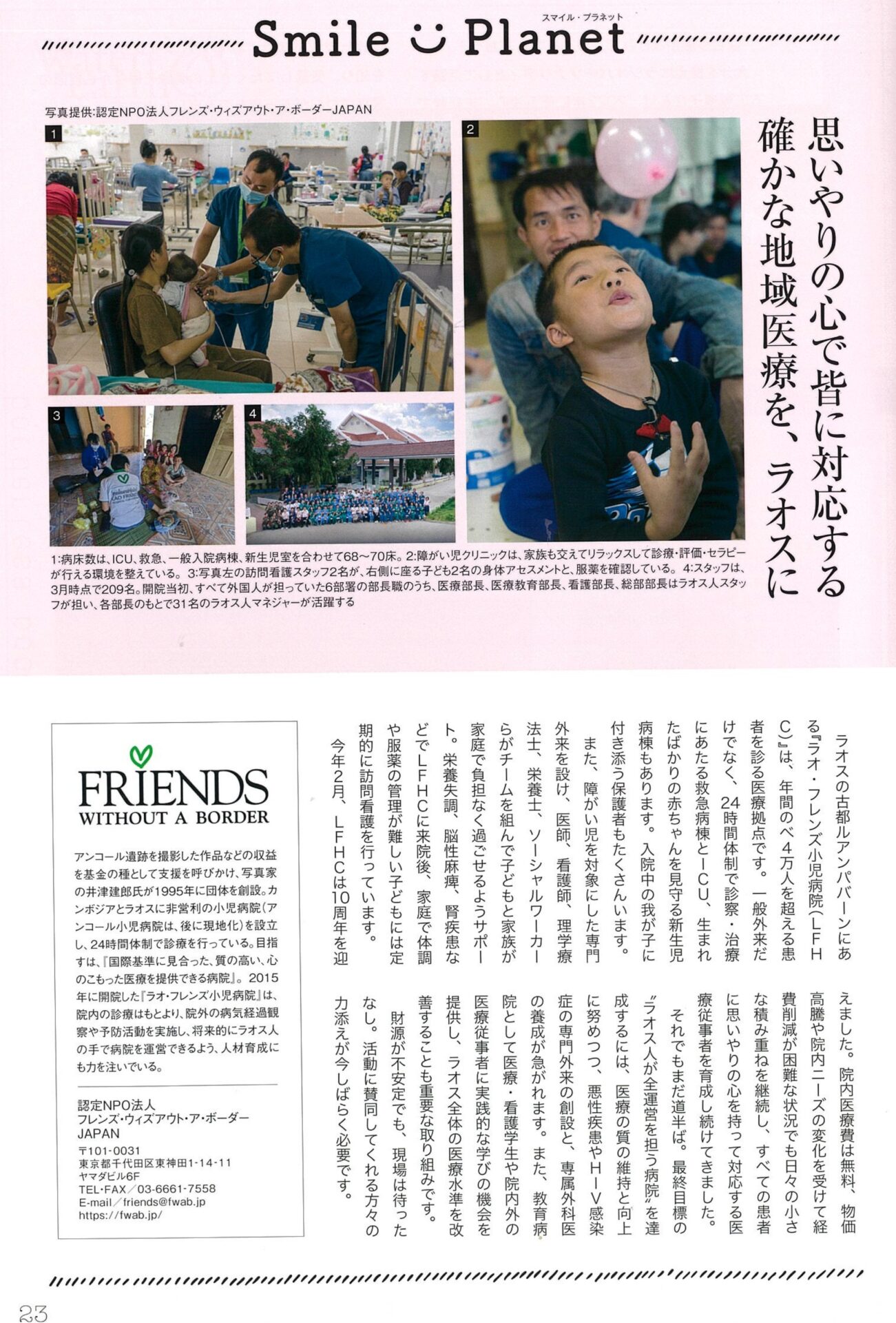 取り上げていただいたのは、同誌「スマイル・プラネット」というコーナーで、今年開院10周年を迎えたラオ・フレンズ小児病院(LFHC)の活動をわかりやすく伝えてくださっています。ただ単に「医療」を提供するだけではないLFHCの存在意義についても触れた内容となっていますので、ぜひご一読ください。