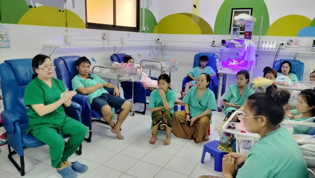 ラオ・フレンズ小児病院(LFHC)の新生児病棟では、カンガルー・マザー・ケア(KMC)が日常的に行われています。